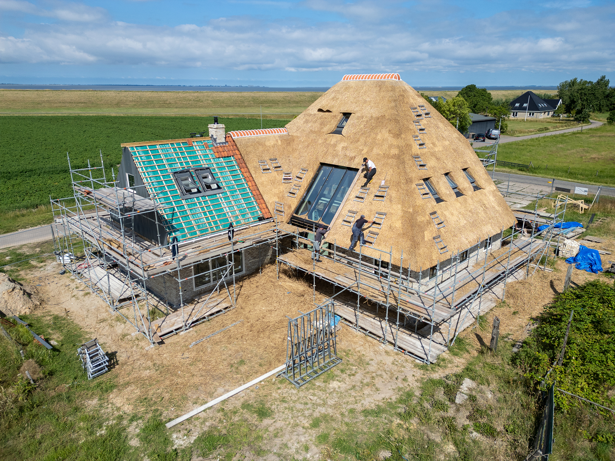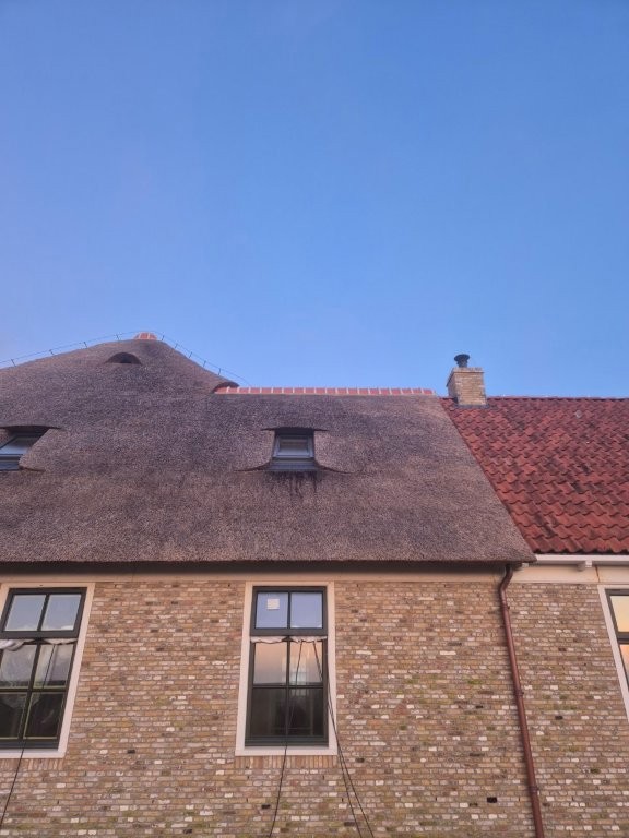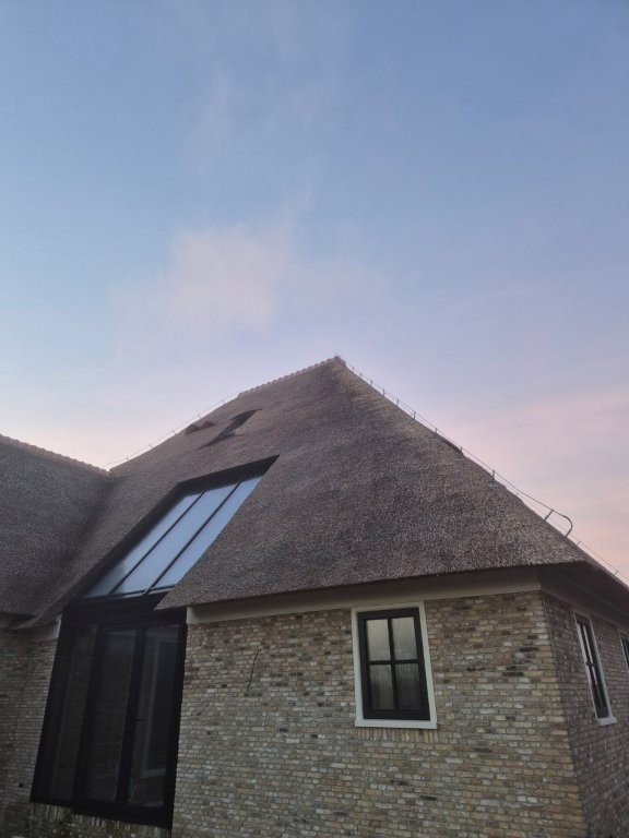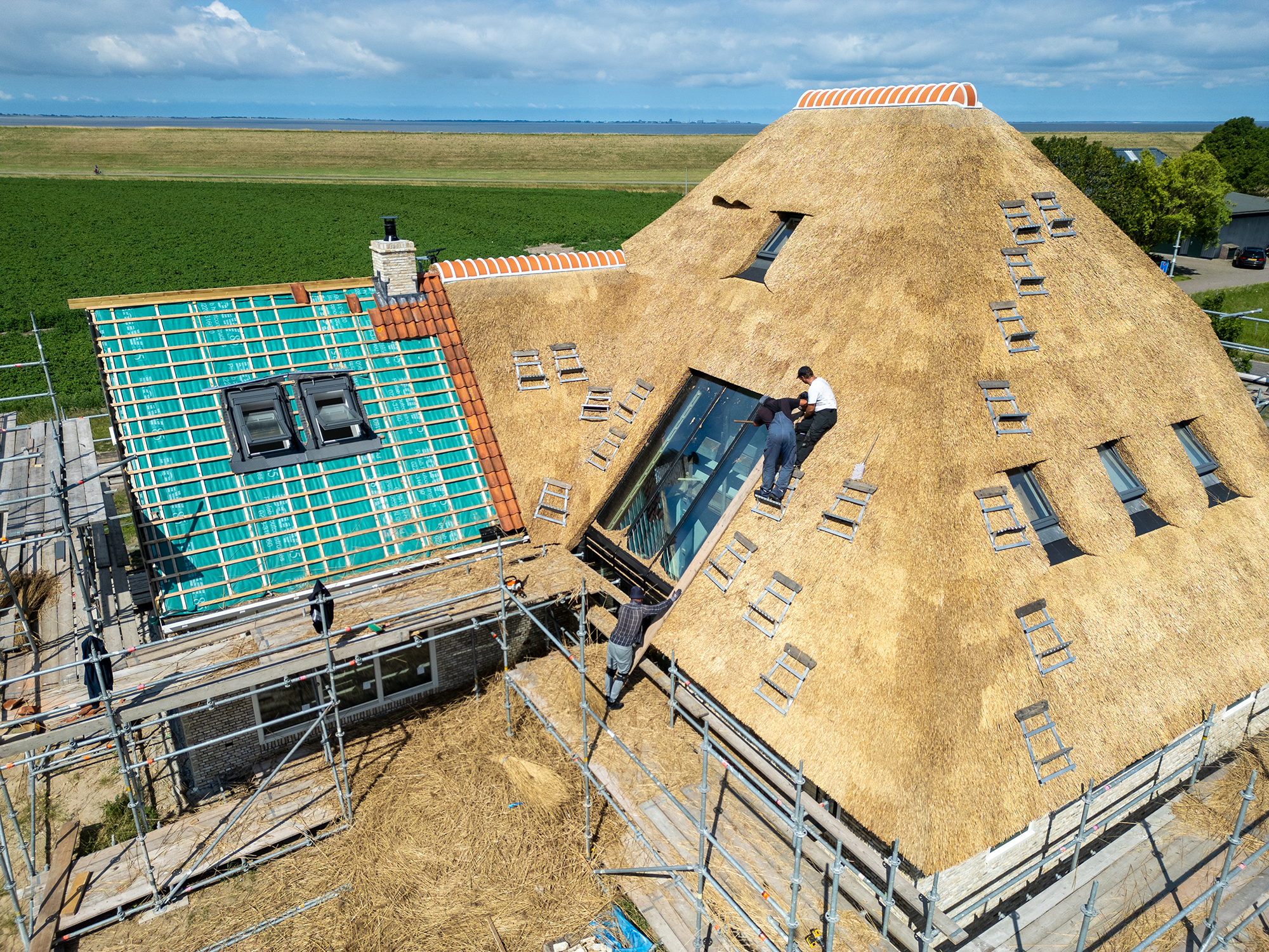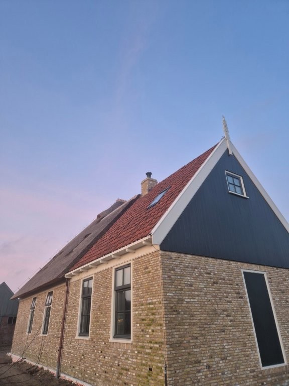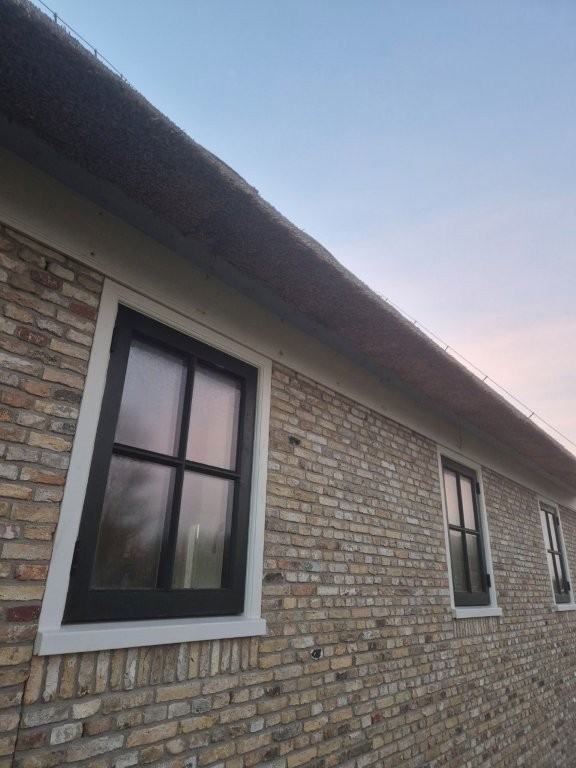 De houten kozijnen van Doedens Kozijnen, uitgevoerd in oude stijl en voorzien van triple beglazing, zorgen voor zowel authentieke charme als moderne isolatie. De gevel is gemetseld door Schouten Metselwerken met oude IJsselstenen in kruisverband, wat het huis zijn warme, karakteristieke uitstraling geeft. Het Nederlandse riet maakt het beeld compleet: een traditionele boerderijvorm met een duurzame, hoogwaardige afwerking.