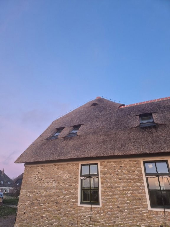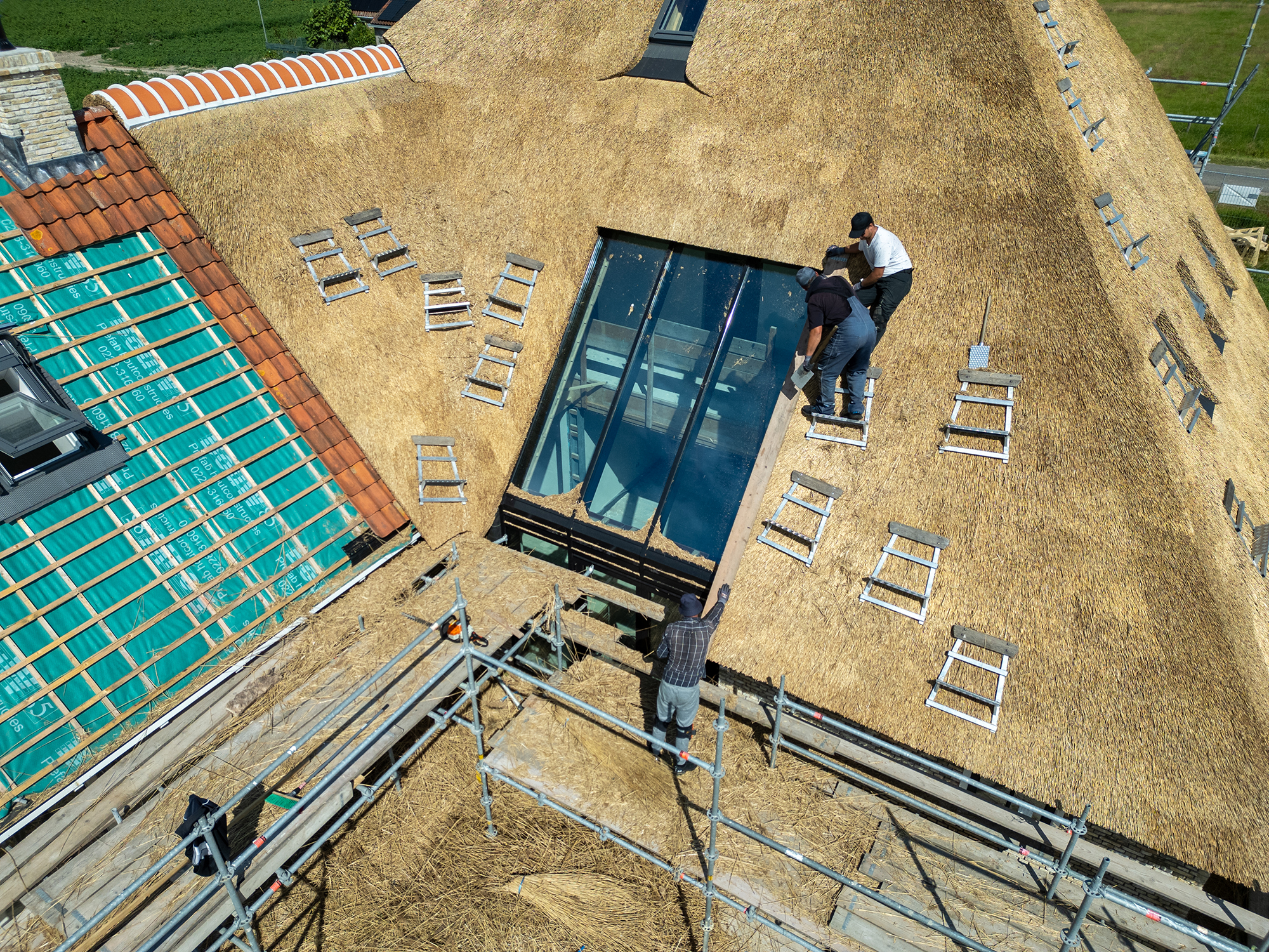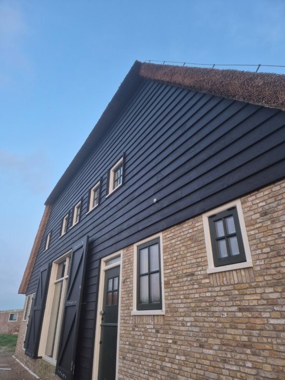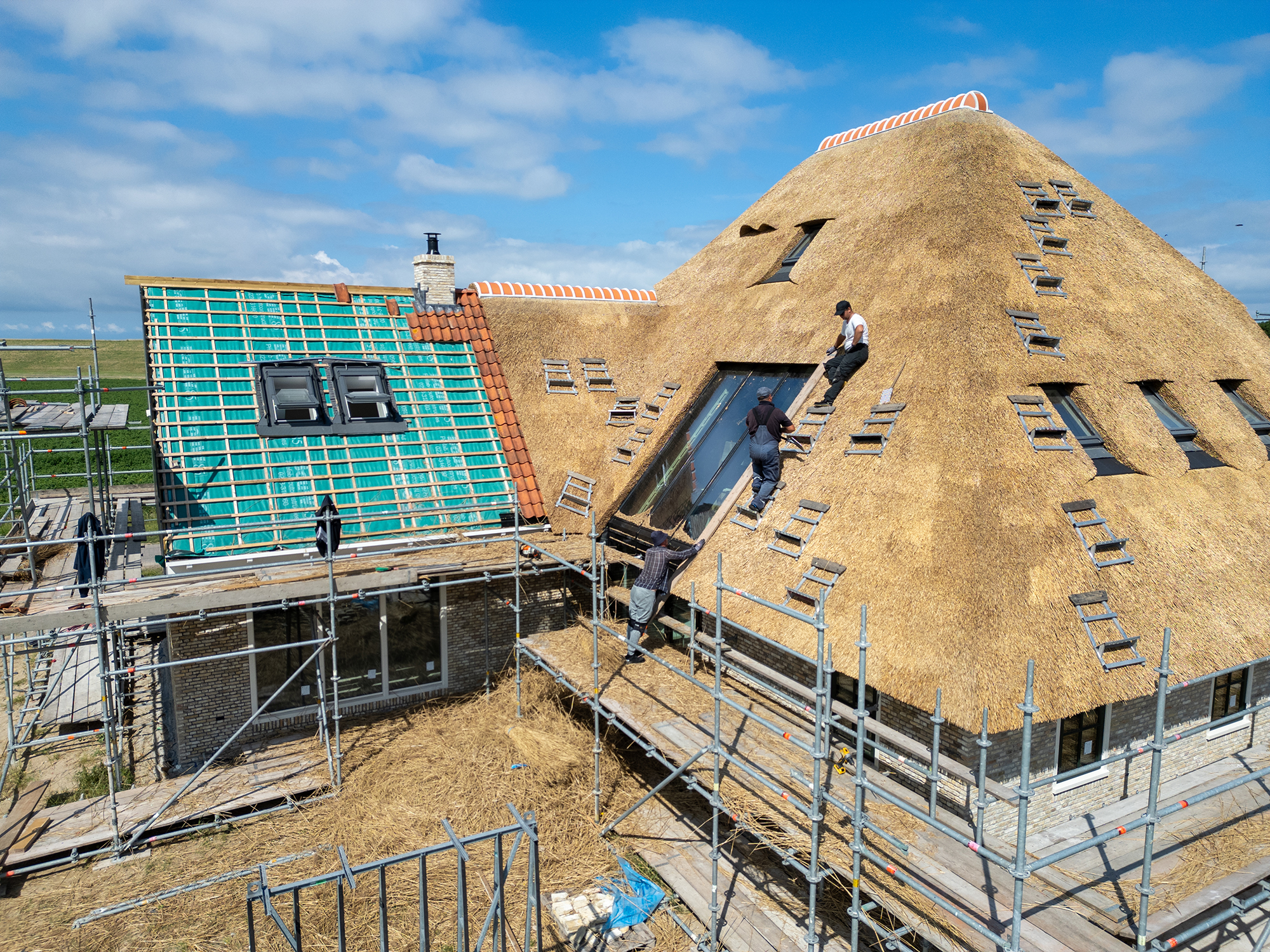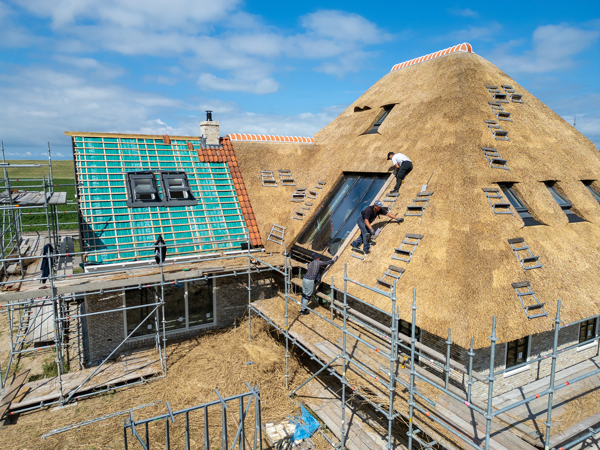De houten kozijnen van Doedens Kozijnen, uitgevoerd in oude stijl en voorzien van triple beglazing, zorgen voor zowel authentieke charme als moderne isolatie. De gevel is gemetseld door Schouten Metselwerken met oude IJsselstenen in kruisverband, wat het huis zijn warme, karakteristieke uitstraling geeft. Het Nederlandse riet maakt het beeld compleet: een traditionele boerderijvorm met een duurzame, hoogwaardige afwerking.