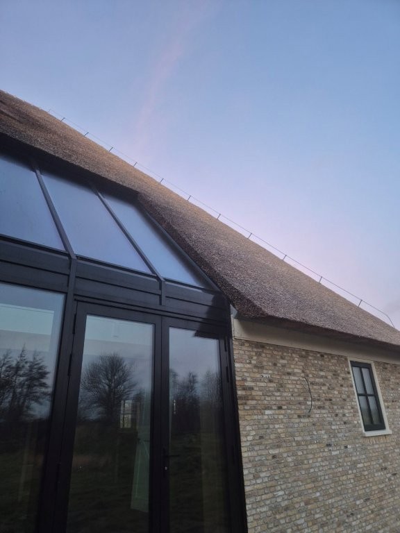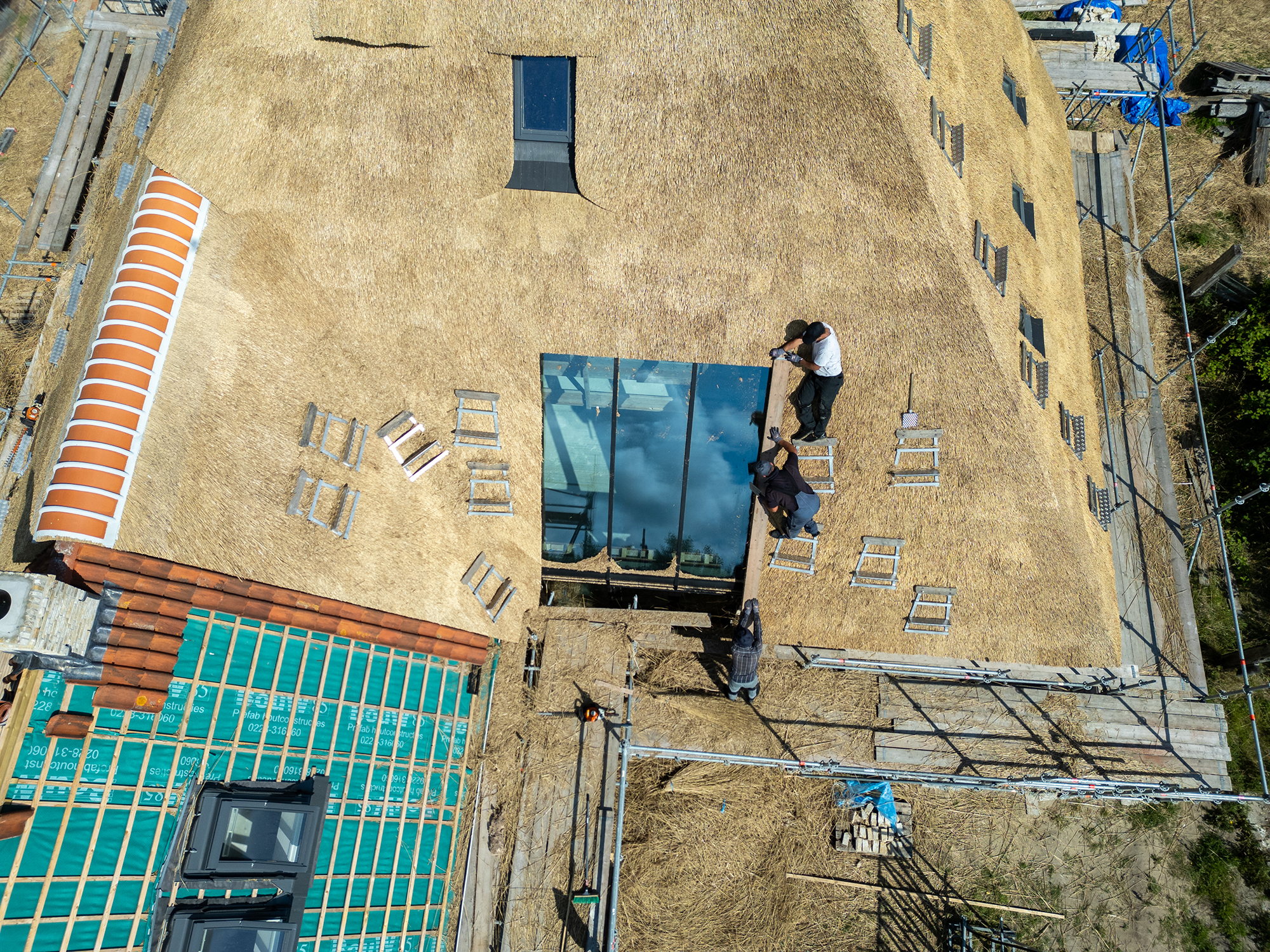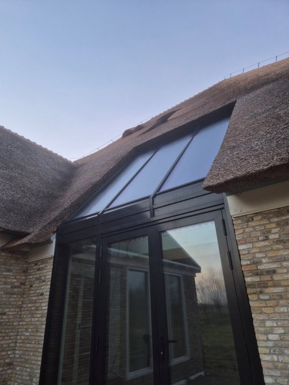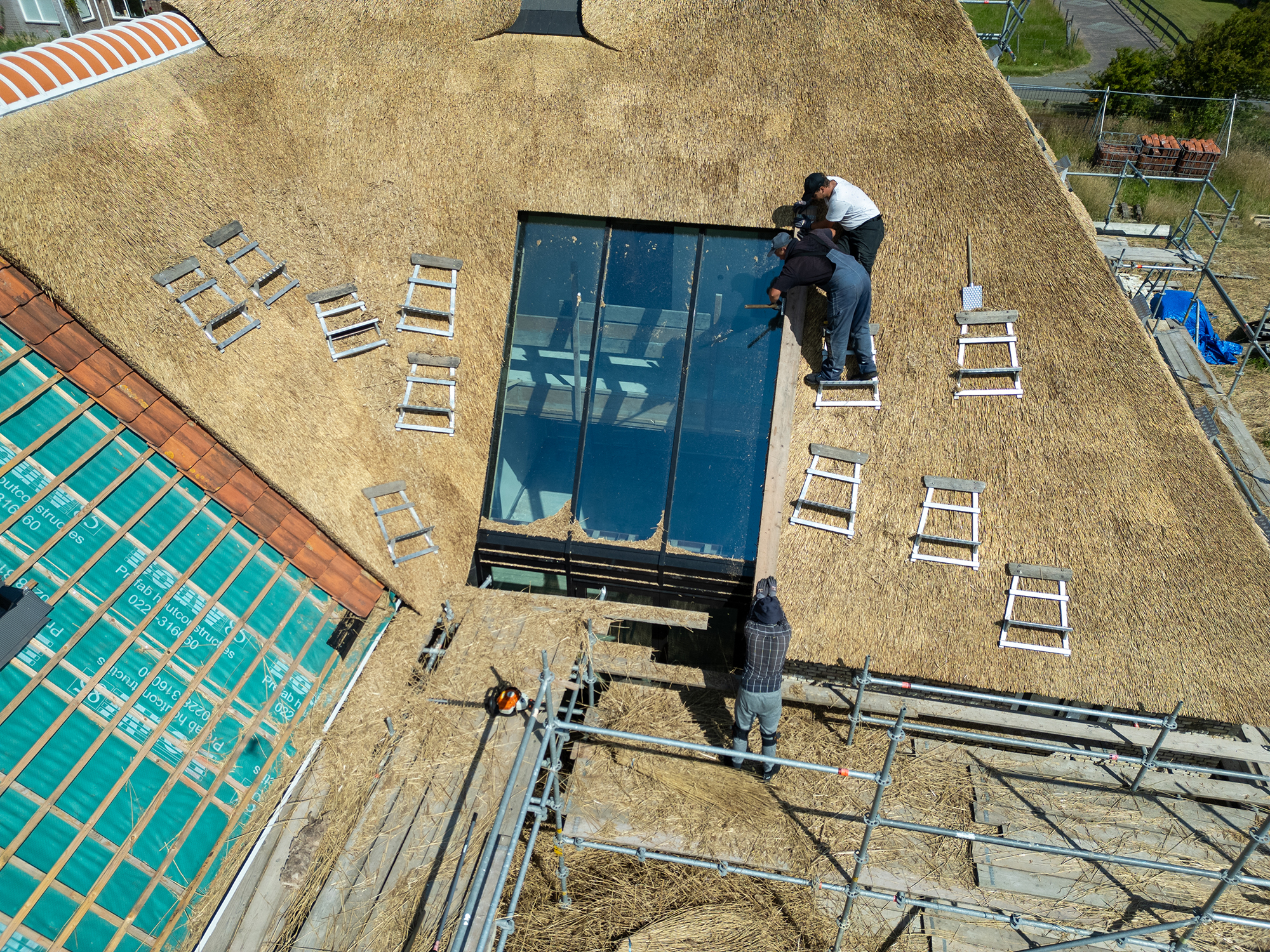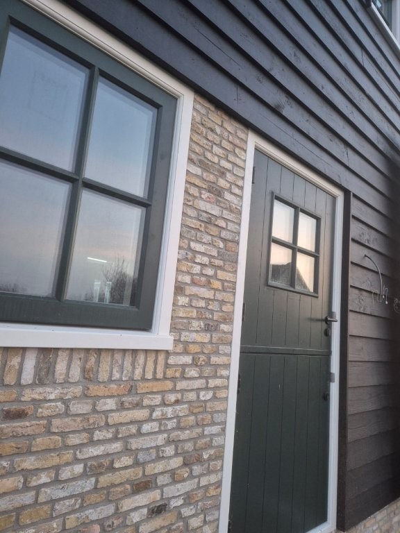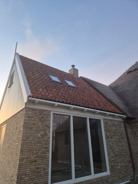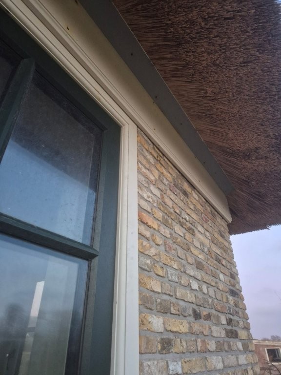 De houten kozijnen van Doedens Kozijnen, uitgevoerd in oude stijl en voorzien van triple beglazing, zorgen voor zowel authentieke charme als moderne isolatie. De gevel is gemetseld door Schouten Metselwerken met oude IJsselstenen in kruisverband, wat het huis zijn warme, karakteristieke uitstraling geeft. Het Nederlandse riet maakt het beeld compleet: een traditionele boerderijvorm met een duurzame, hoogwaardige afwerking.